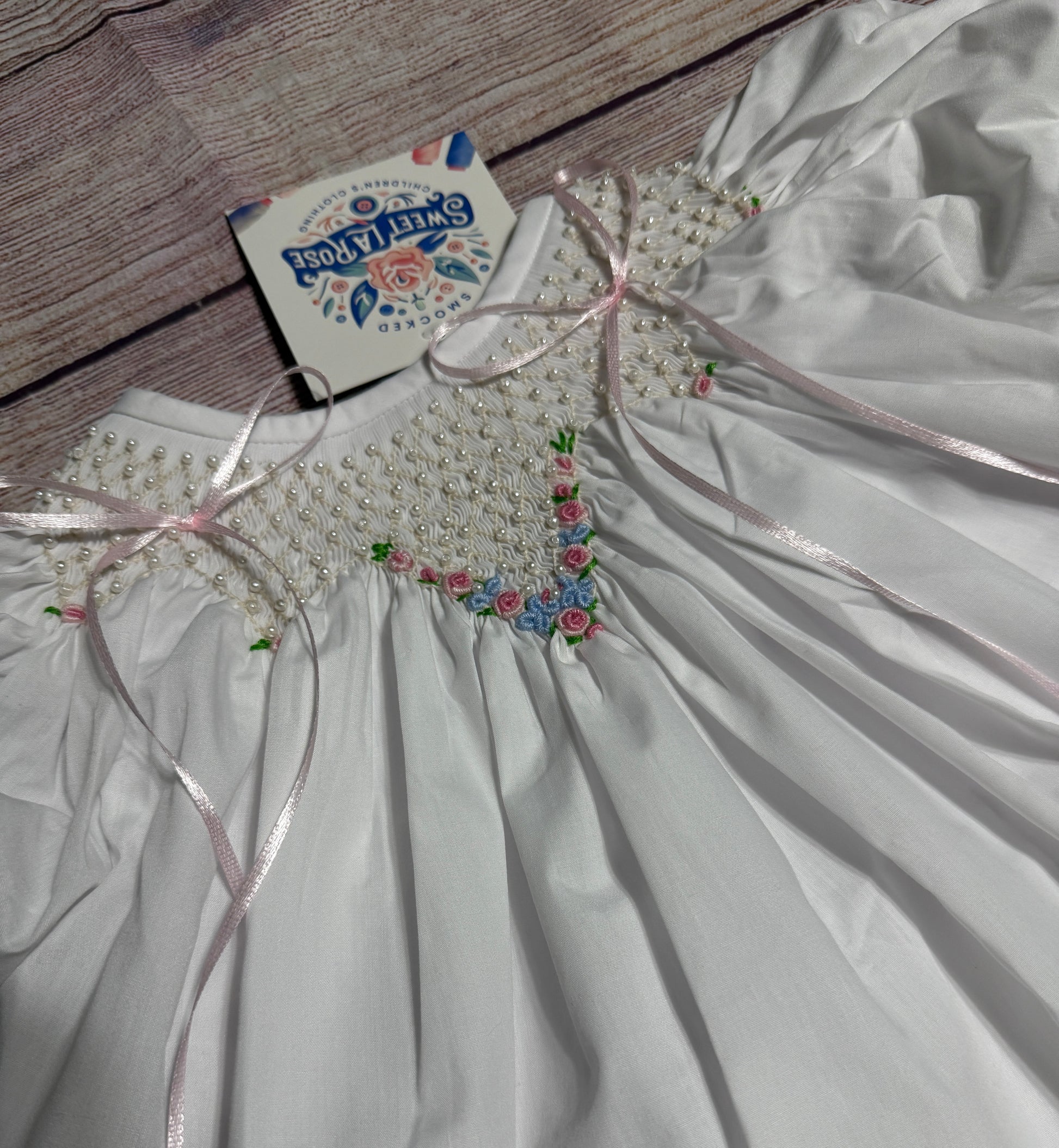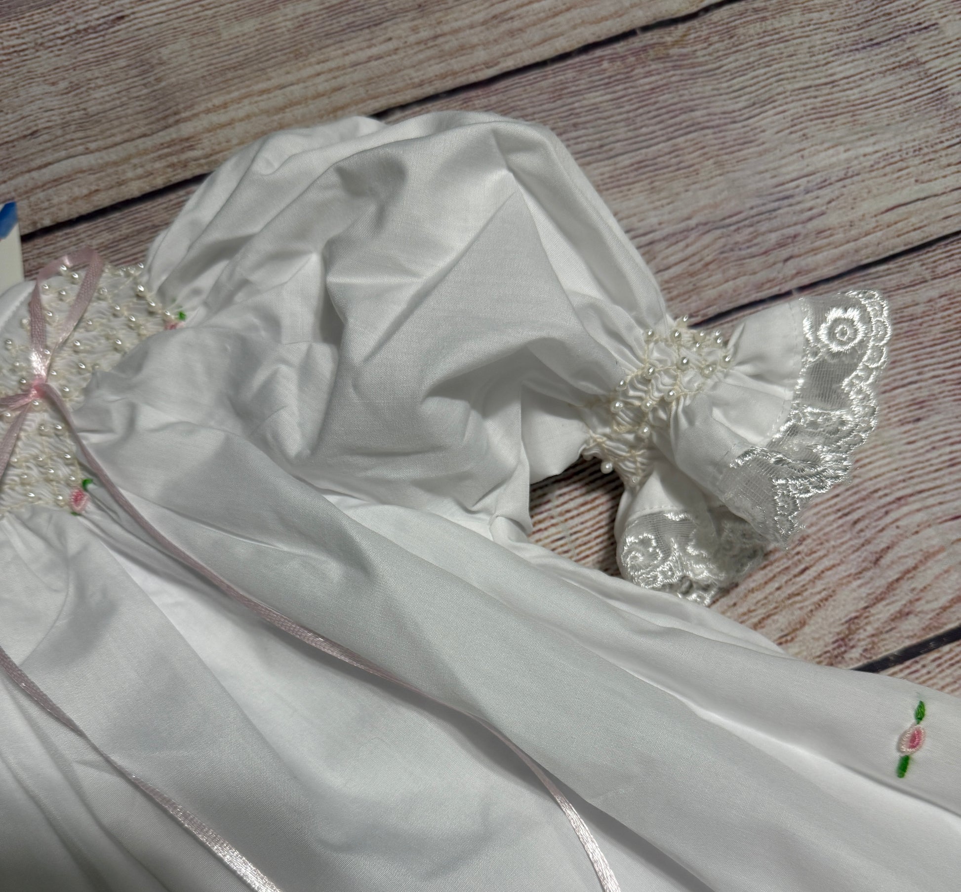 WHITE HEIRLOOM SMOCKED EMBROIDERED FLORAL BLOOMER SET w/ PEARLS & SATIN RIBBONS (heirloom #1 extras)